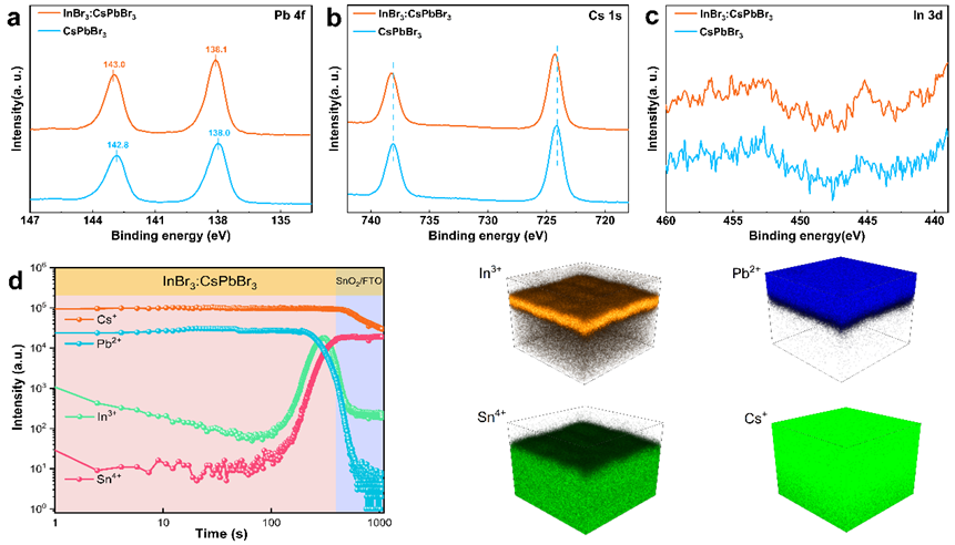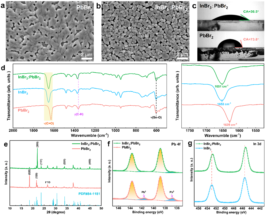 我院迟凯粼老师团队在SnO2基溴化铯铅钙钛矿太阳能电池研究中取得进展。通过在PbBr2的DMF前驱液中引入InBr3,利用路易斯酸InBr3与路易斯碱DMF所形成的InBr3(DMF)3加合物,成功的在平面SnO2基底上制备出具有多孔结构InBr3:PbBr2薄膜以增加其对CsBr前驱液的润湿性。InBr3(DMF)3加合物不仅能抑制薄膜中Pb0杂质的生成,而且可以有效地诱导PbBr2薄膜的生长取向。以InBr3:PbBr2薄膜为基础所制得的InBr3:CsPbBr3薄膜具有更高的相纯度和基底覆盖率。经InBr3诱导生长后的InBr3:CsPbBr3薄膜具有更好的薄膜生长质量和更小的非辐射复合,器件的电子注入与收集能力得到明显改善。此项研究对未来进一步研究CsPbBr3薄膜的面外非均匀晶体结构和优化器件性能提供了一定的借鉴意义。