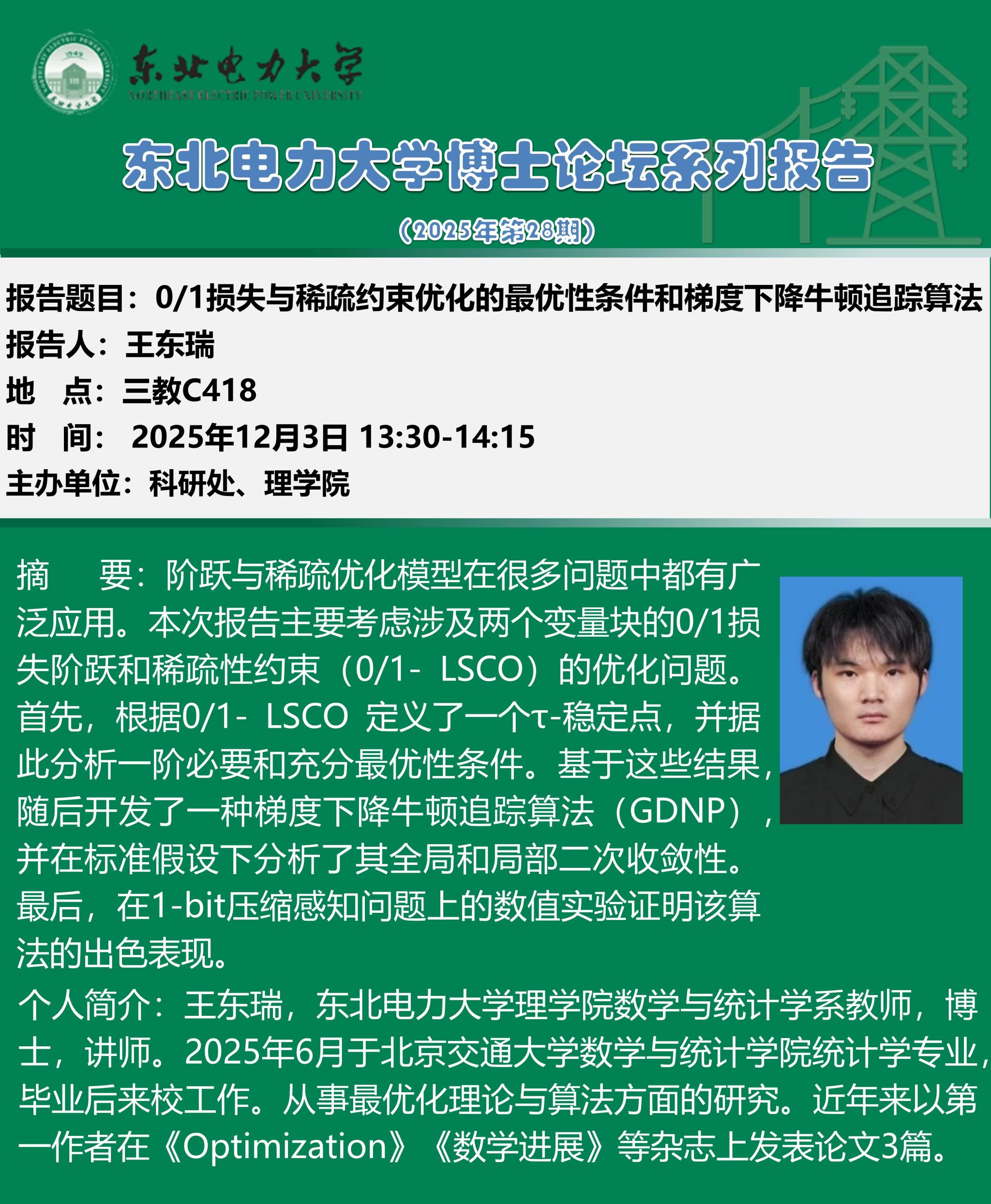 报告人简介:王东瑞,东北电力大学理学院数学与统计学系教师,博士,讲师。2025年6月于北京交通大学数学与统计学院统计学专业,毕业后来校工作。从事最优化理论与算法方面的研究。近年来以第一作者在《Optimization》《数学进展》等杂志上发表论文3篇。